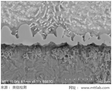 对样品进行切割、镶嵌、研磨、抛光、微蚀后,表面镀铂金,按照标准作业流程放入扫描电子显微镜样品室中,对客户要求的测试位置进行放大观察并测量。